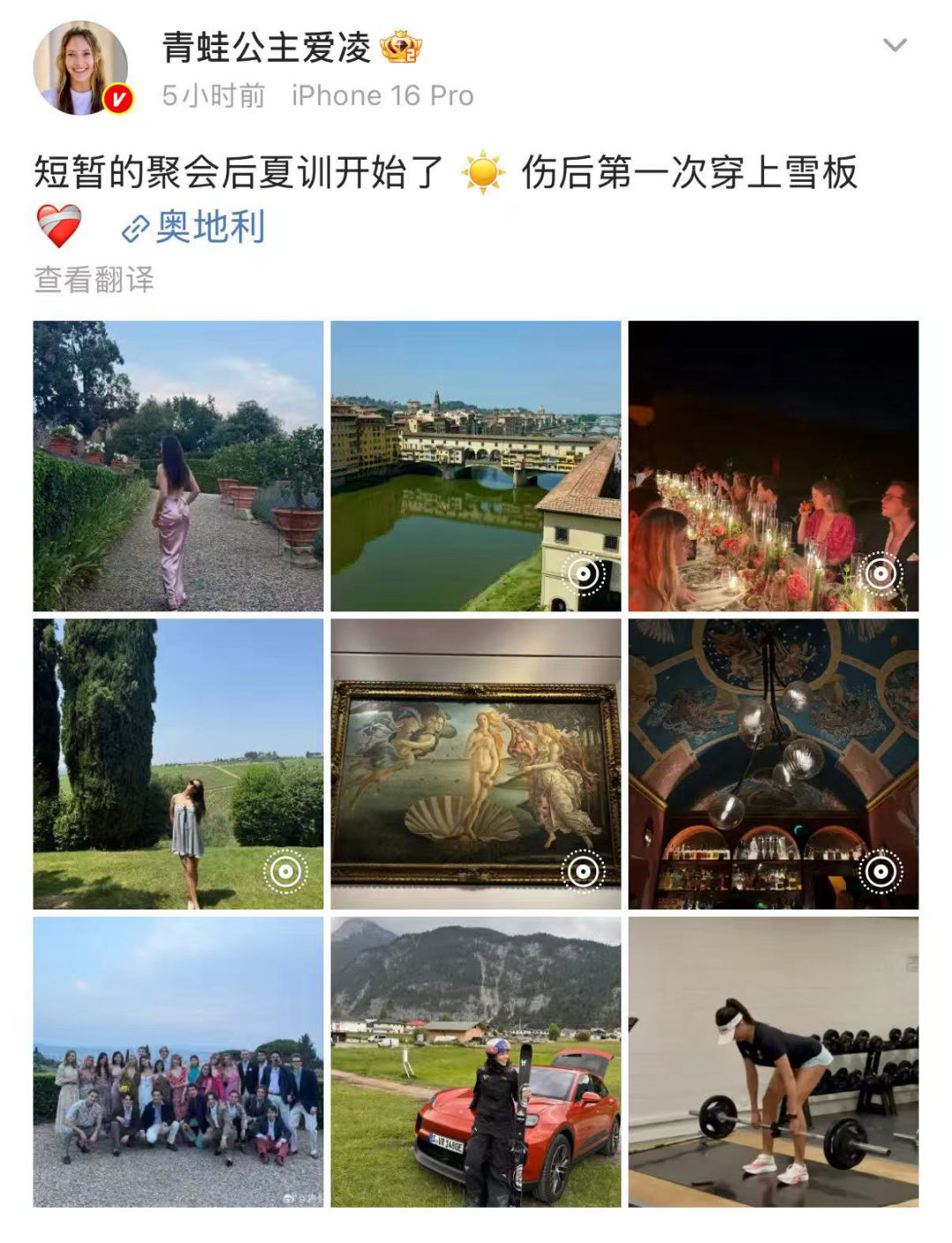 6月17日凌晨,谷爱凌发博称:短暂的聚会后夏训开始了,伤后第一次穿上雪板